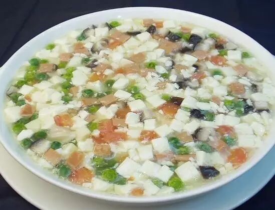 f 炒锅洗净,倒少量食用油烧热,将蒸豆腐的汤汁倒入,调入适量盐、鸡精,用水淀粉勾芡浇在豆腐上即可。