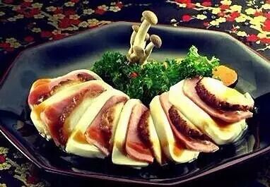 d 一片豆腐,一片素火腿,半片香菇,依次摆放;