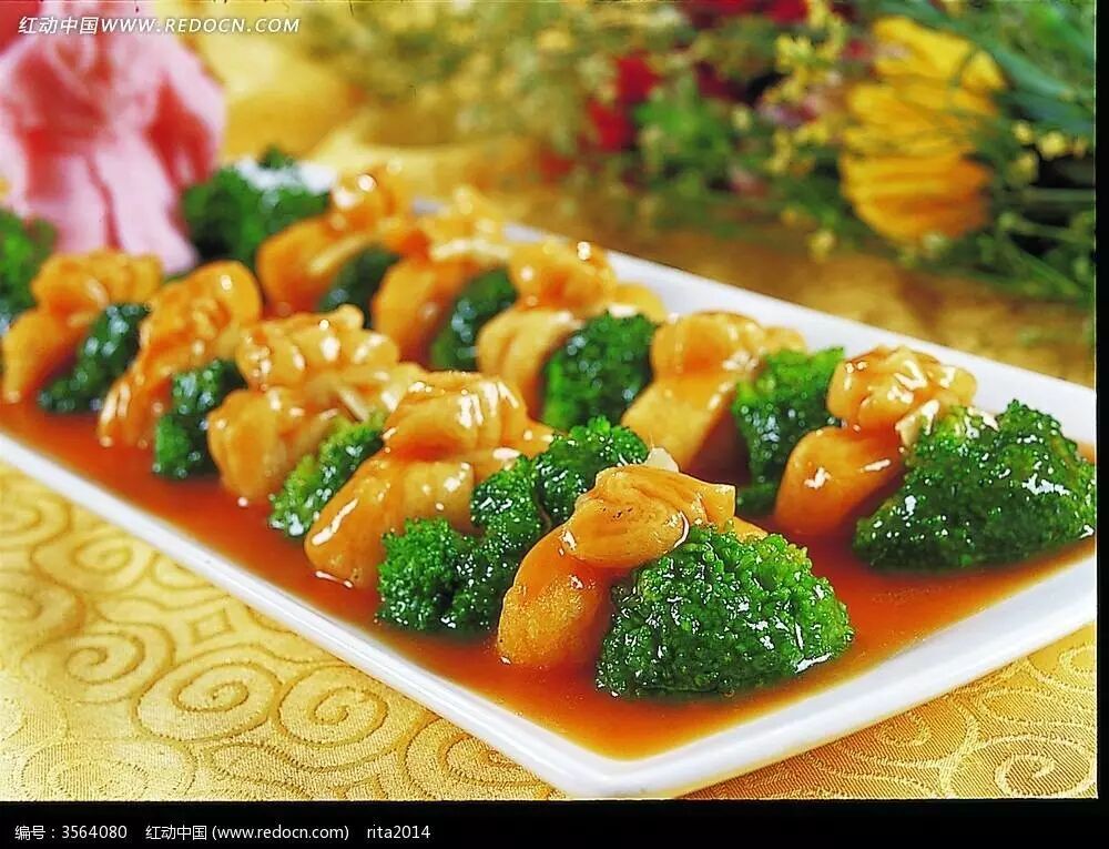 c 用刀在芥兰梗的一边每隔1cm斜切一刀,在冷水里浸泡,卷成花形。油盐水里焯一下,捞出;