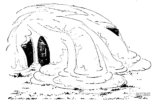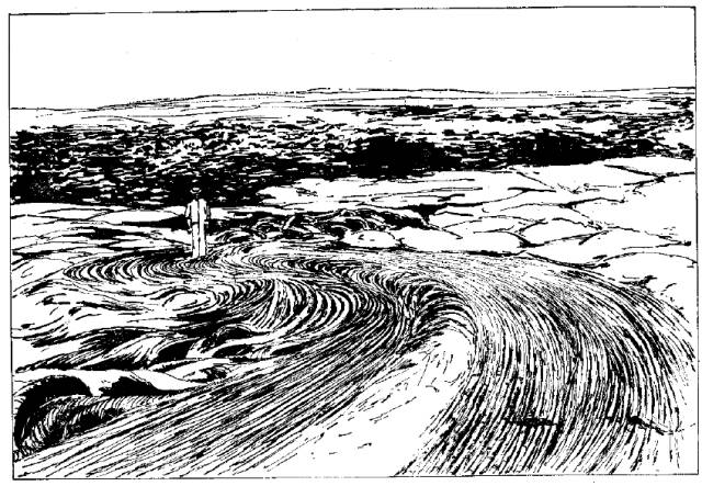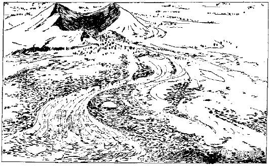 岩浆溢出地面时,常沿地面的一定坡度流动,成大面积的片状或带状覆盖地面,形成熔岩地貌。