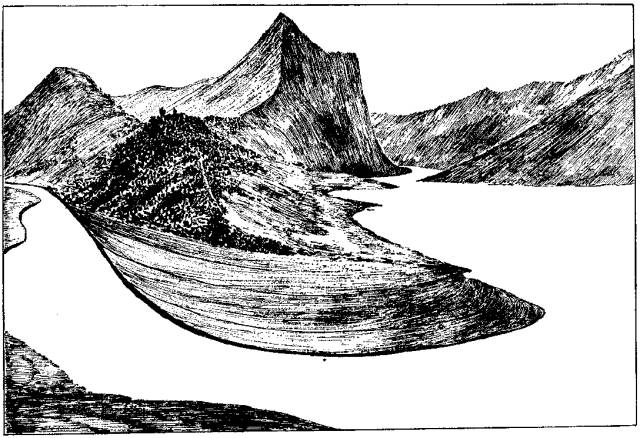 角峰:三个以上的冰斗同时向山顶侵蚀,山体逐渐窄小,最后形成孤独而尖锐的角峰。