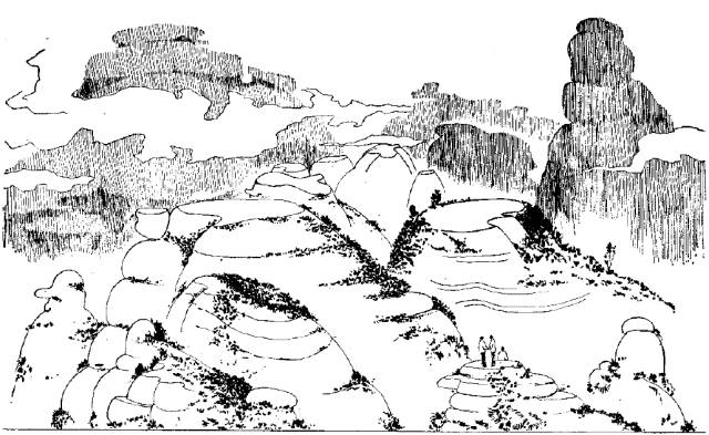 溶洼(溶盆、溶原)-丘峰于地壳隆起的山地,在垂直渗流作用的条件下,溶斗演化呈溶洼→溶盆→溶原,岩丘进一步切割呈丘峰。