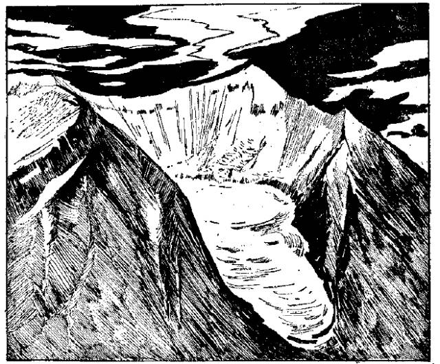 冰斗:形似围椅状的冰蚀洼地,冰斗底部平坦低洼,它的三面为悬崖环绕,仅在坡基部开着缺口。