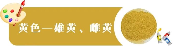 矿物颜料的黄色,主要取自于雄黄与雌黄。雄黄,矿物化学式As2S4,常呈暗红—桔红色。雌黄,矿物化学式As2S3,常呈橘黄—柠檬黄色。雌黄和雄黄经常共生在一起,犹如一对伴侣,因而常被称为“矿物鸳鸯”。早在古埃及以及文艺复兴时期,雄黄和雌黄即被用于矿物颜料。