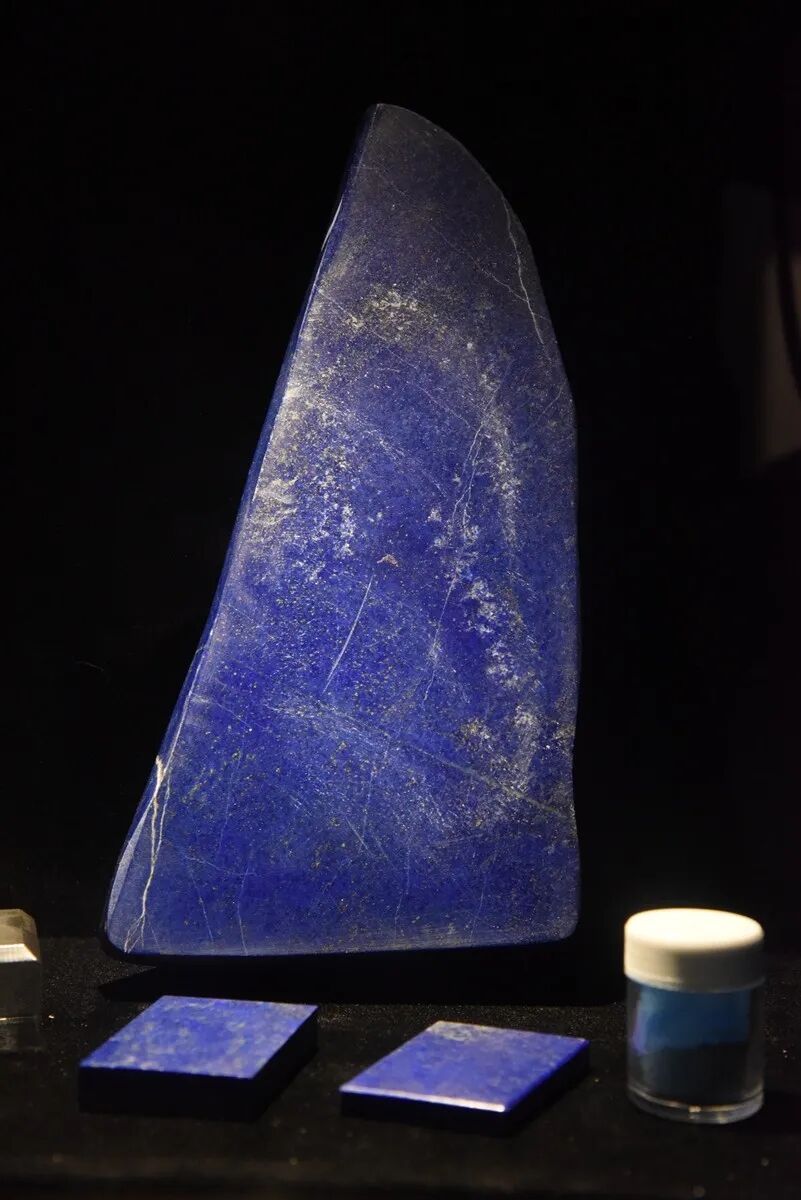 青金石是一种贵重的天然矿物颜料,在我国古代,人们很早就将它用于绘画中。青金石,又名金精、佛青、回回青等,常含有浸染状的黄铁矿,似金星闪烁,故称青金石。青金石呈深蓝色、紫色,有时为天青色或带绿的蓝色,颜色纯度高,具有很强的视觉穿透性,艳丽而纯粹。