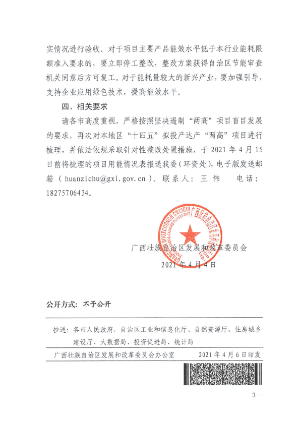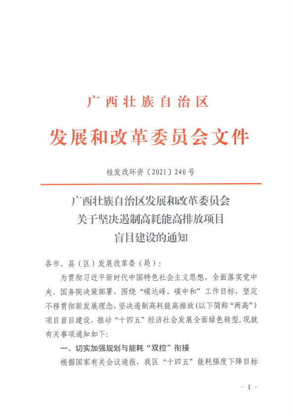 4月初,广西壮族自治区发改委印发《关于坚决遏制高耗能高排放项目盲目建设的通知》,指出,根据国家有关会议通报,广西“十四五”能耗强度下降目标为13.5%,能耗消费增量为1170万吨标准煤。从目前掌握的情况,各市拟于“十四五”投产达产的“两高”项目新增能耗大幅超出“十四五”全区新增用能空间,能耗“双控”形势十分严峻。