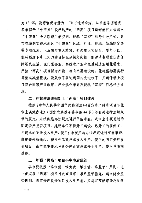该通知要求,各市在编制实施本地区“十四五”区域、产业、能源、新基建发展等专项规划,以及制定重大政策、布局重大项目时,要与不低于能耗强度下降13.5%的目标充分做好衔接。严控“两高”项目新增产能,确有必要建设的,能耗指标要实行等量或减量置换。