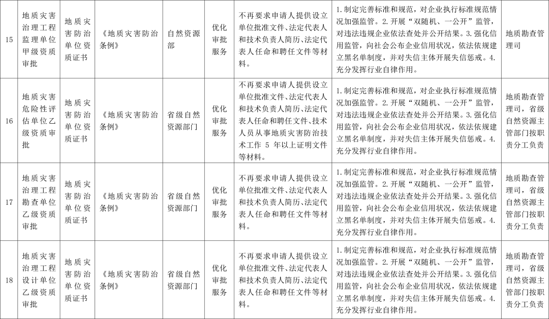 2.对“地质灾害危险性评估单位甲级资质审批”“地质灾害治理工程勘查单位甲级资质审批”“地质灾害治理工程设计单位甲级资质审批”“地质灾害治理工程施工单位甲级资质审批”“地质灾害治理工程监理单位甲级资质审批”“地质灾害危险性评估单位乙级资质审批”“地质灾害治理工程勘查单位乙级资质审批”“地质灾害治理工程设计单位乙级资质审批”“地质灾害治理工程施工单位乙级资质审批”“地质灾害治理工程监理单位乙级资质审批”等10项涉企经营许可事项,精简审批材料,减轻企业负担。(责任单位:地质勘查管理司,省级自然资源主管部门按职责分工负责)