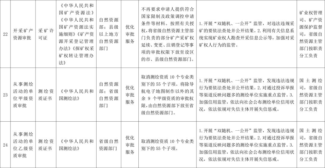根据国发〔2021〕7号文件有关要求,《中央层面设定的涉企经营许可事项清单(2021年全国版)》规定的自然资源管理涉企经营许可事项,按照直接取消审批、实行告知承诺、优化审批服务等方式分类推进行政审批制度改革,力争2022年底前建立简约高效、公正透明、宽进严管的行业准营规则,大幅提高市场主体办事的便利度和可预期性。