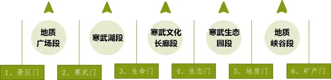 为了改变芒砀山“残山废水”的现实状况,把芒砀山变成“金山银山”,永城市人民政府在河南省山水地质旅游公司的技术支持下,决定运用“地质+”“+文化”“+生态”的理念,通过建设地质公园来实现“既改变了环境、又促进了地方经济发展”的治理目标。并针对公园的具体现状,精心策划了“五段六门”文旅格局。