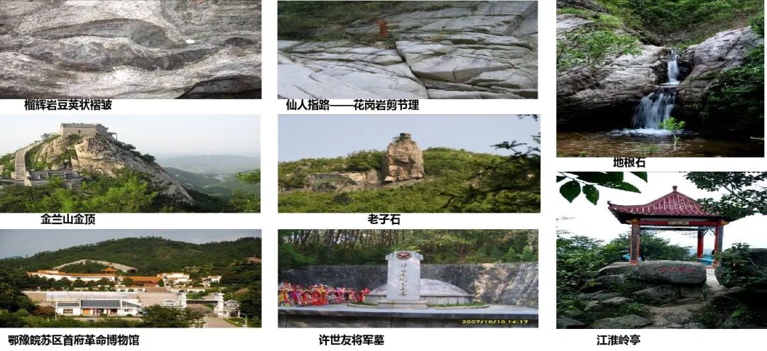 地质公园包括了新县境内的金兰山、江淮岭、黄毛尖三个园区,卧佛山、江淮岭、香山湖、金兰山、连康山、九龙潭、西大山、黄毛尖、白云山九个景区。金兰山、江淮岭、黄毛尖、腊树堂榴辉岩、花岗岩象形石、南北坡迥异的植被面貌、许世友将军墓、鄂豫皖苏区首府等等,是地质公园最典型的地质遗迹、自然文化景观;大别山干部学校是河南省著名的红色教育培训基地。